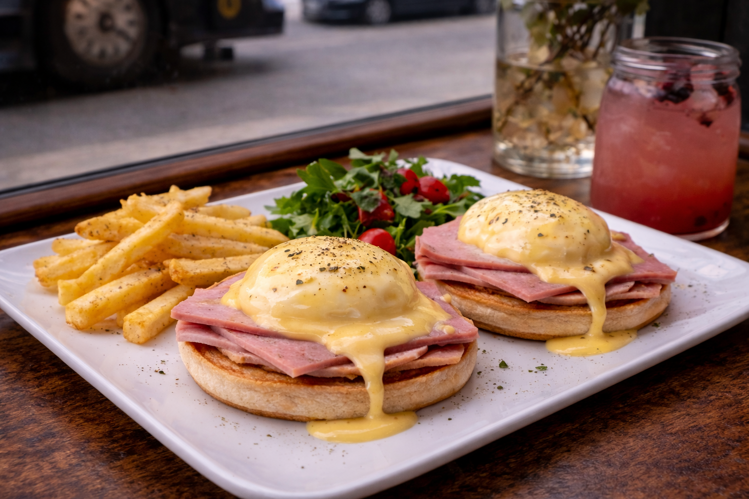 Ham slices on a toasted English muffin, topped with two poached eggs and house hollandaise.