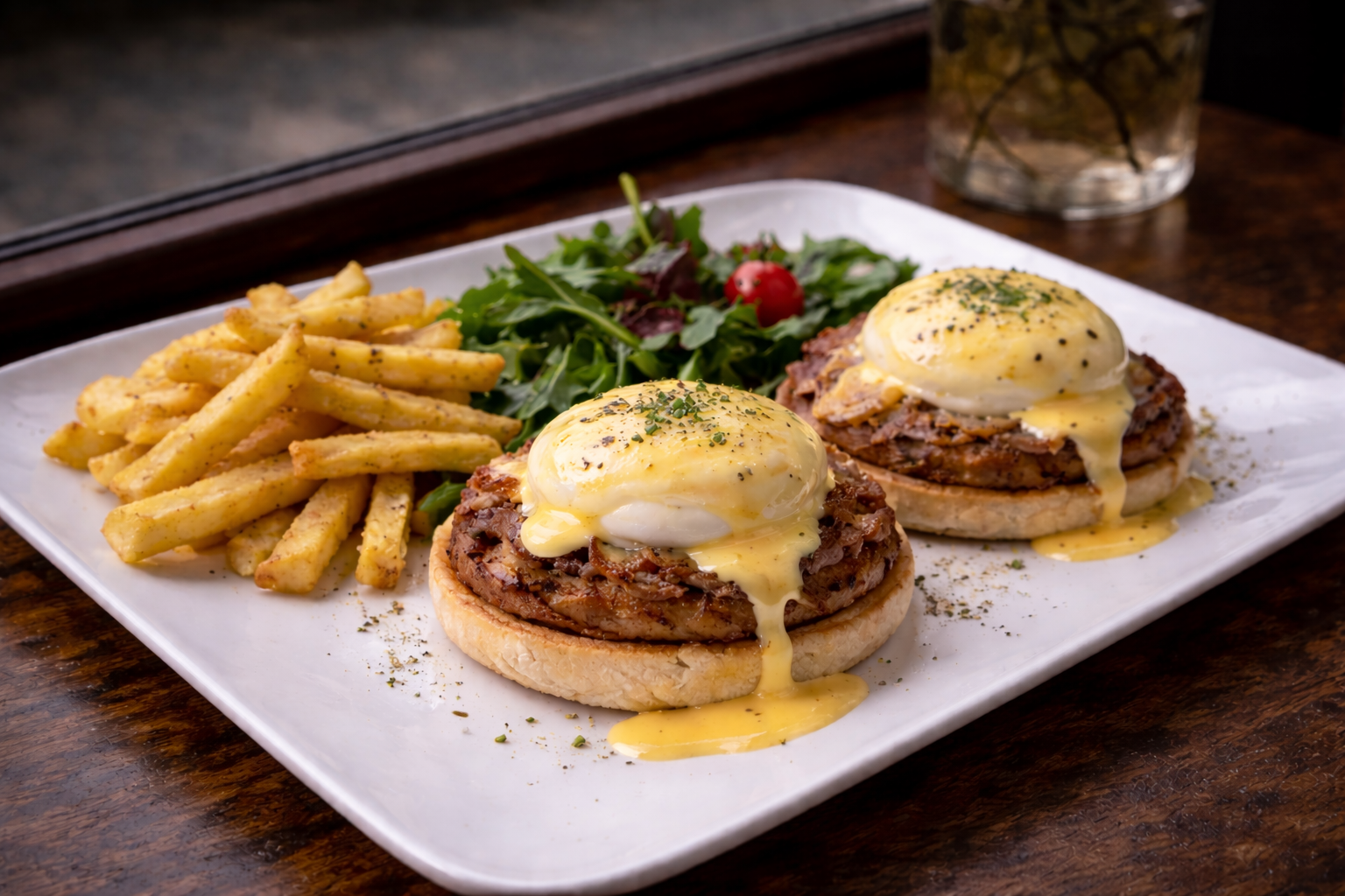 Slow-roasted beef layered on a toasted English muffin, topped with two poached eggs and house hollandaise.