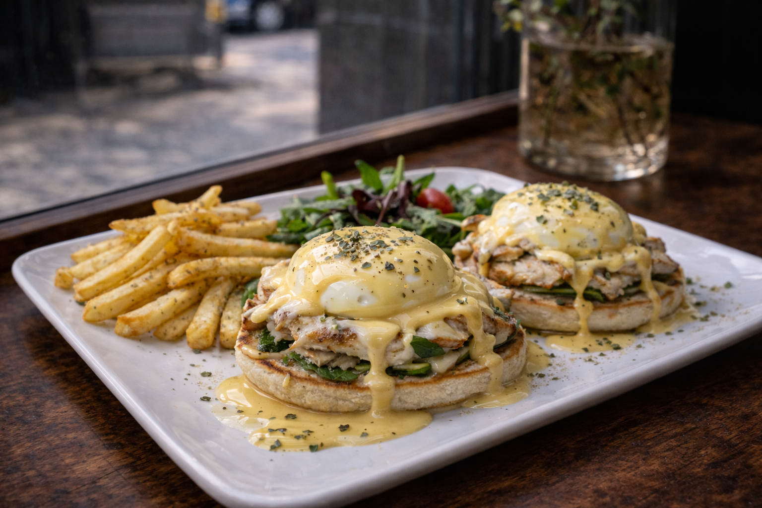 Grilled chicken breast on a toasted English muffin, topped with two poached eggs and house hollandaise.