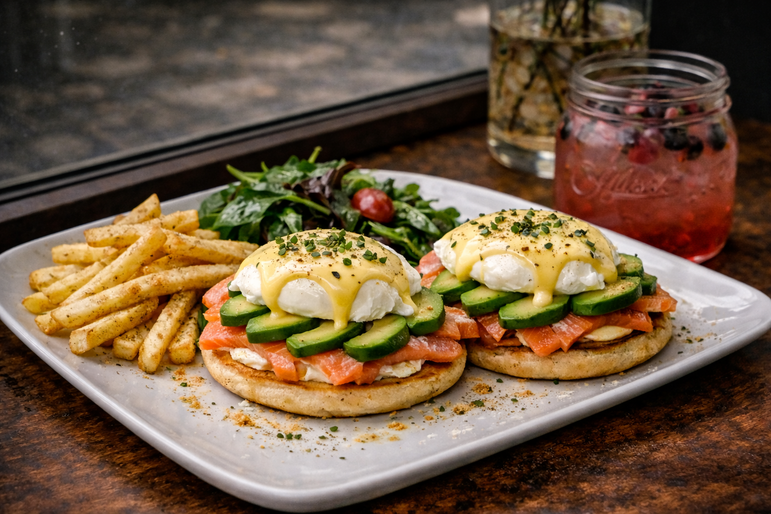 Smoked salmon and fresh avocado on a toasted English muffin, finished with two poached eggs and house hollandaise.