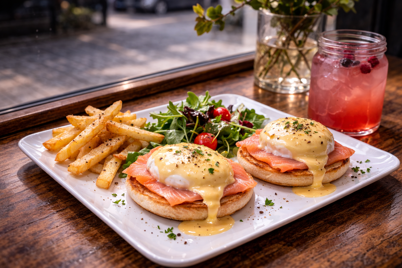 Smoked salmon on a toasted English muffin with two poached eggs and house hollandaise.